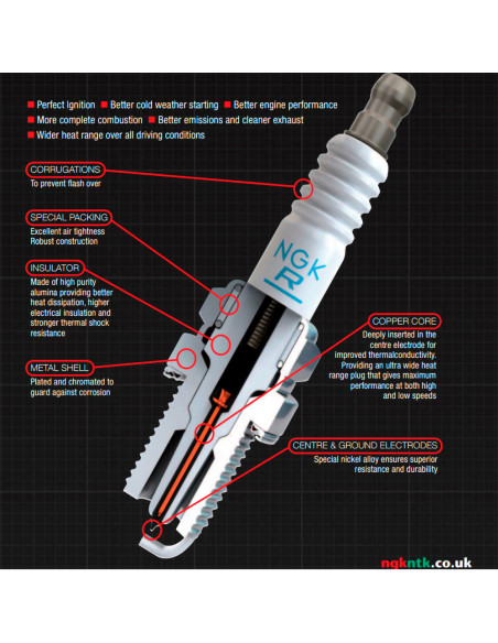 Las Bujías de níquel NGK cuentan con un electrodo central con ranura en V especialmente diseñado, que mejora la inflamabilidad y reduce el enfriamiento. El núcleo de cobre puro al 98% ofrece una mayor disipación de calor para arranques más confiables y menor riesgo de sobrecalentamiento.